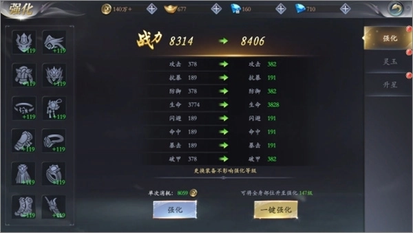 装备镶嵌灵玉后即可获取属性增益加成有效提升战力。