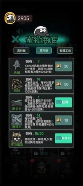 去蜜罐商店选购道具时,黑科技分类下的维修台和能量罩是必入款,这两样搭配使用能让维修台的效果提升50%;其余道具可根据关卡需求灵活选购。另外要留意,商城里通过观看视频能获取房门升级卡,还有修勾魔盒——它既能在剧情里随机变成一种可用道具,也能用来免费升级炮塔。