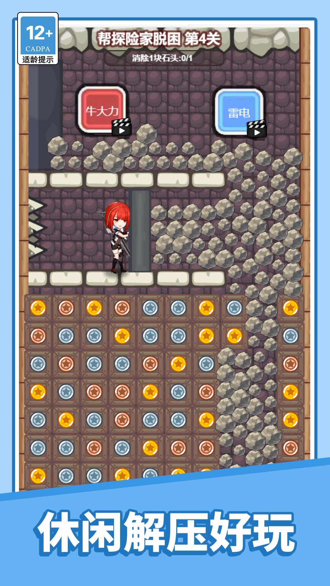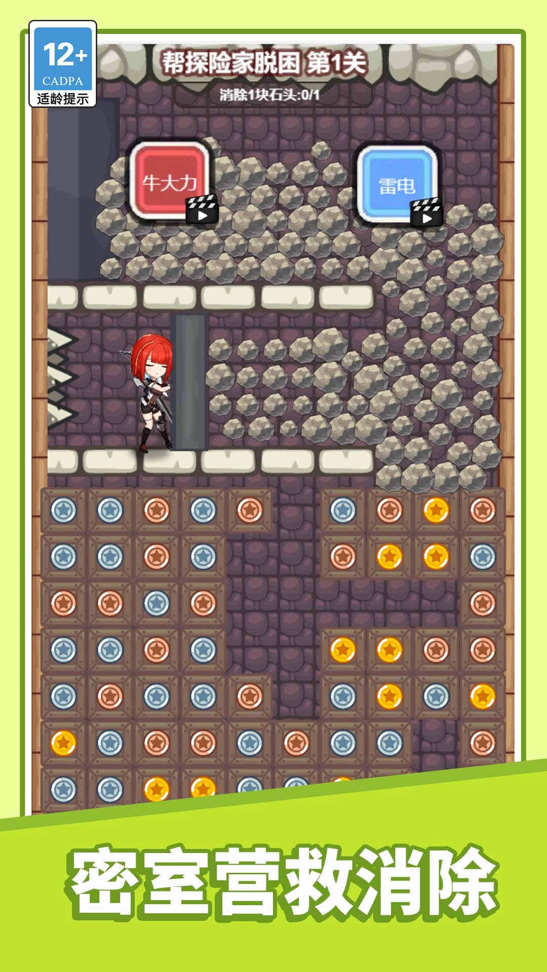 1.这是一款以救援为主题的消除类闯关游戏,核心玩法是通过消除障碍,为下落的石头打通路径,从而解救被困的角色。