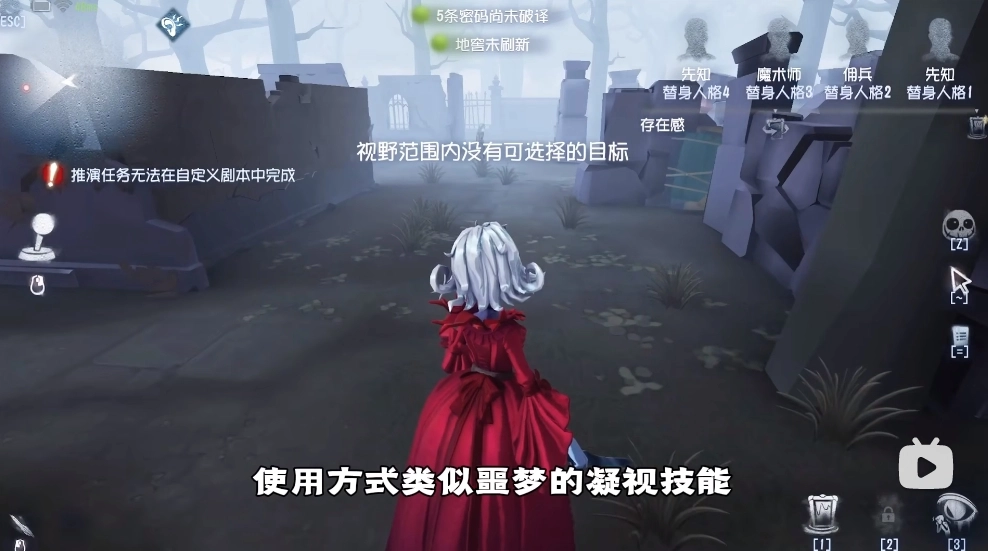 它是使用方法跟噩梦的凝视技能相似,可以选择事业范围内一定距离内的目标,被指定的求生者会持续一段时间暴露自己的位置,并且在四周生成一道时间持续30秒的墙,并且墙壁会逐渐的缩小,只有在监管者在使用自身技能的时候才会短暂的停止。出圈的求生者会被眩晕三秒。只有圈的时间到了或者出圈被眩晕才会结束。如果求生者是在圈内被打,圈还是在的。